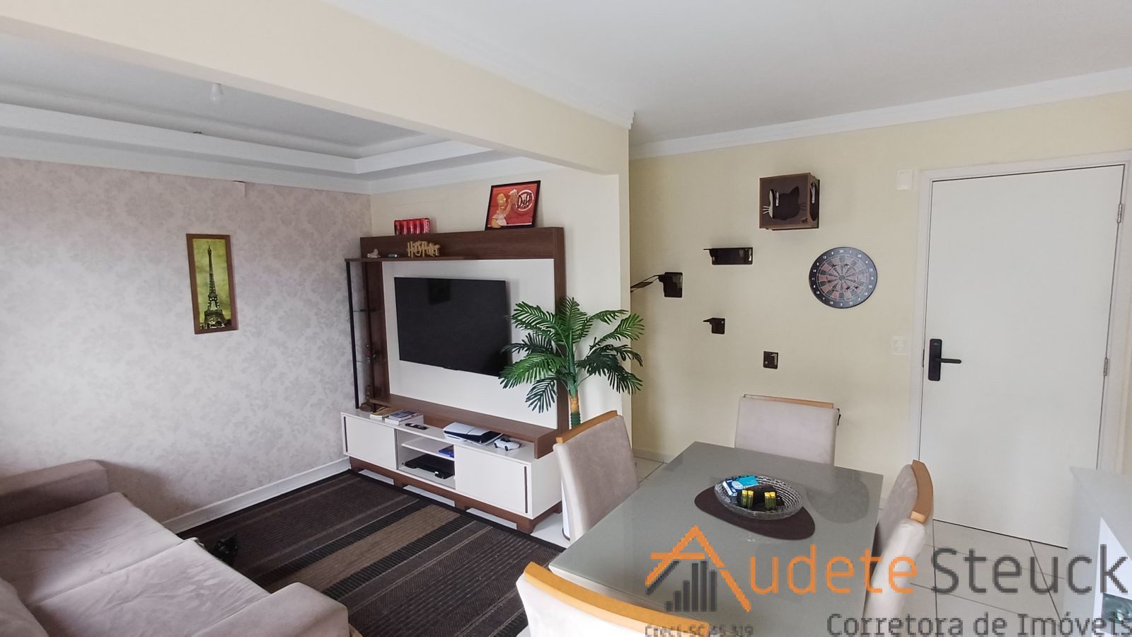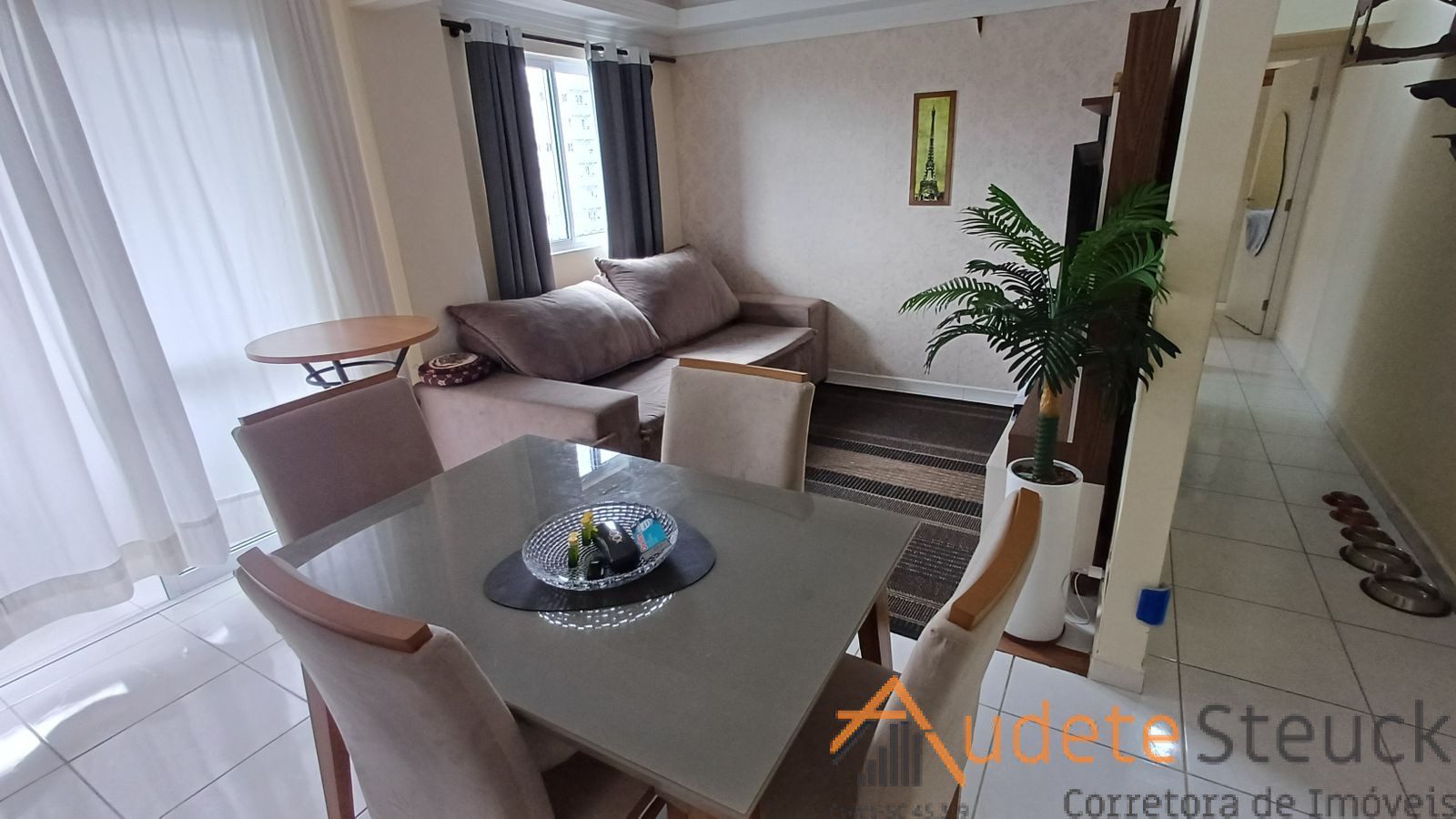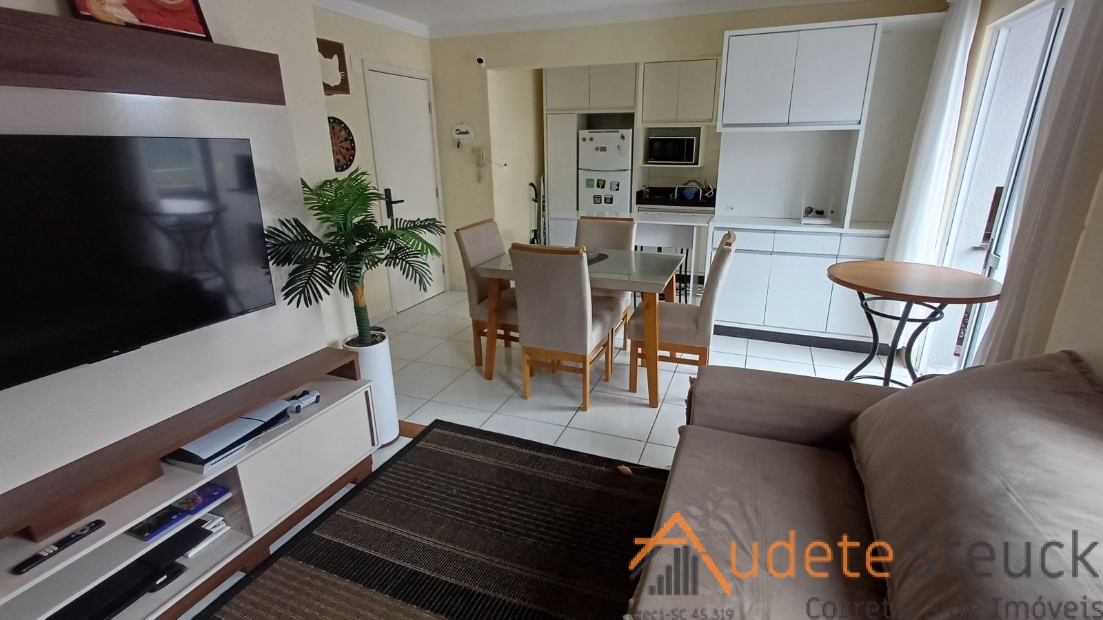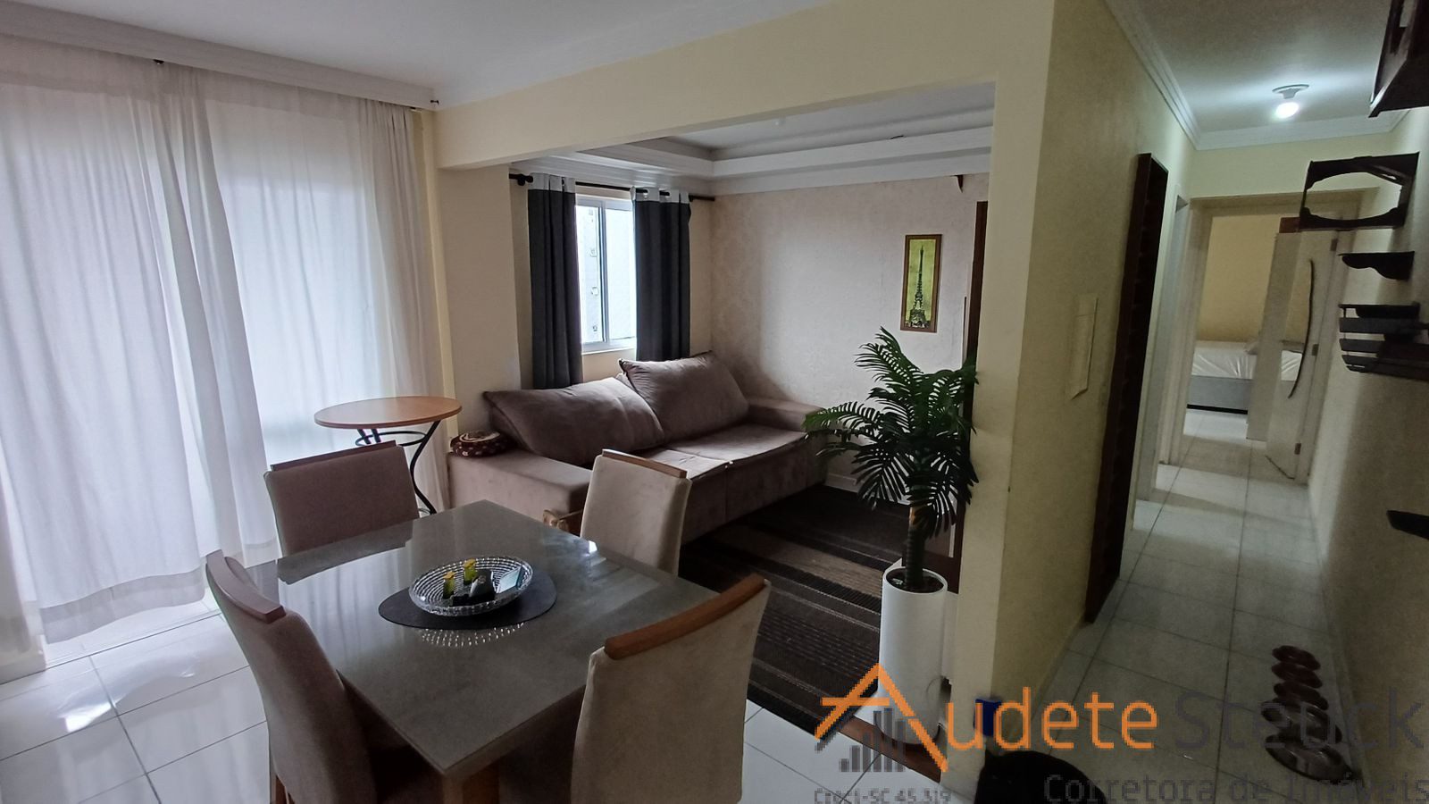 • Sala de Estar/Jantar: Sofá confortável, tapete, mesa de jantar com cadeiras.