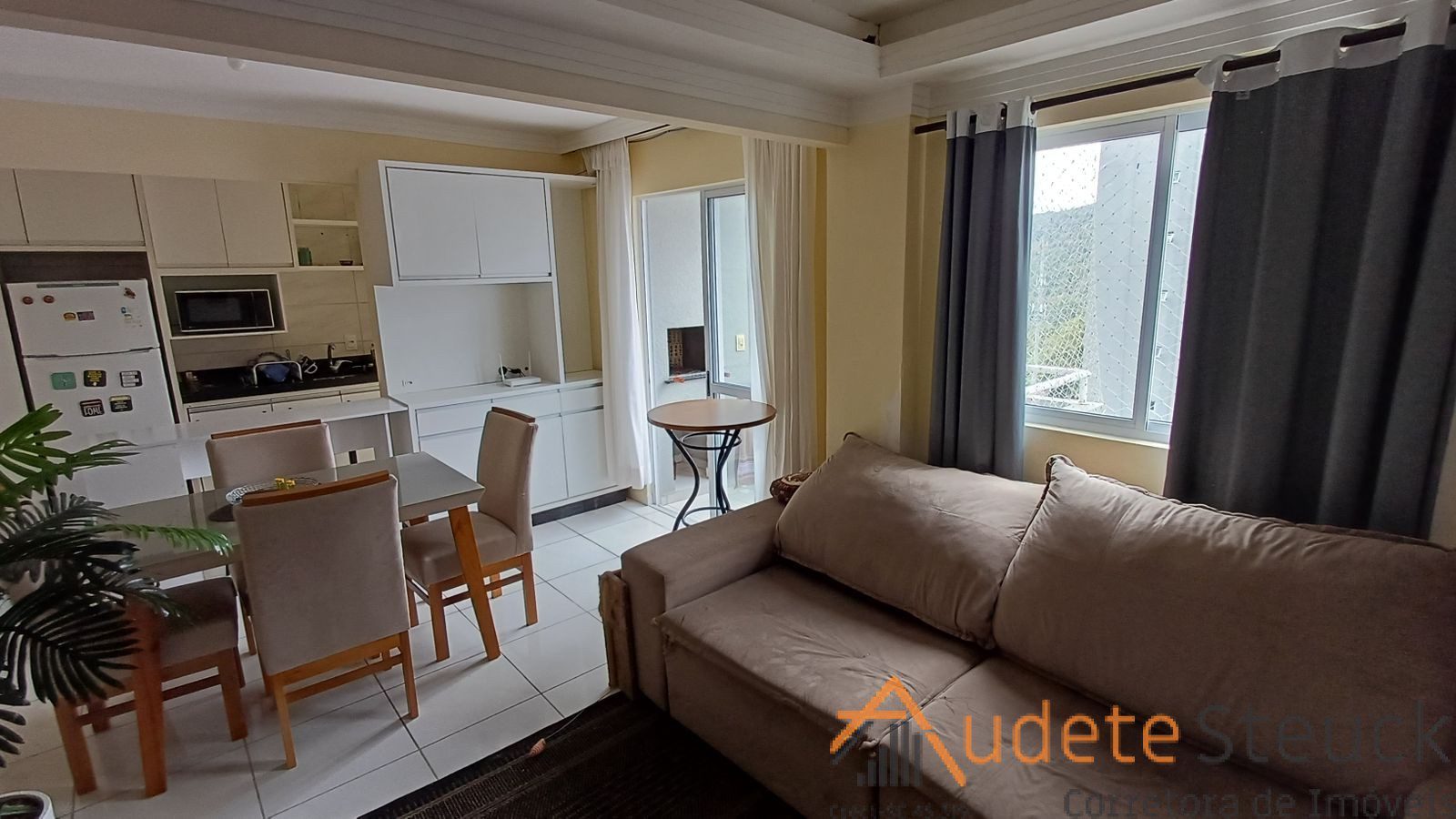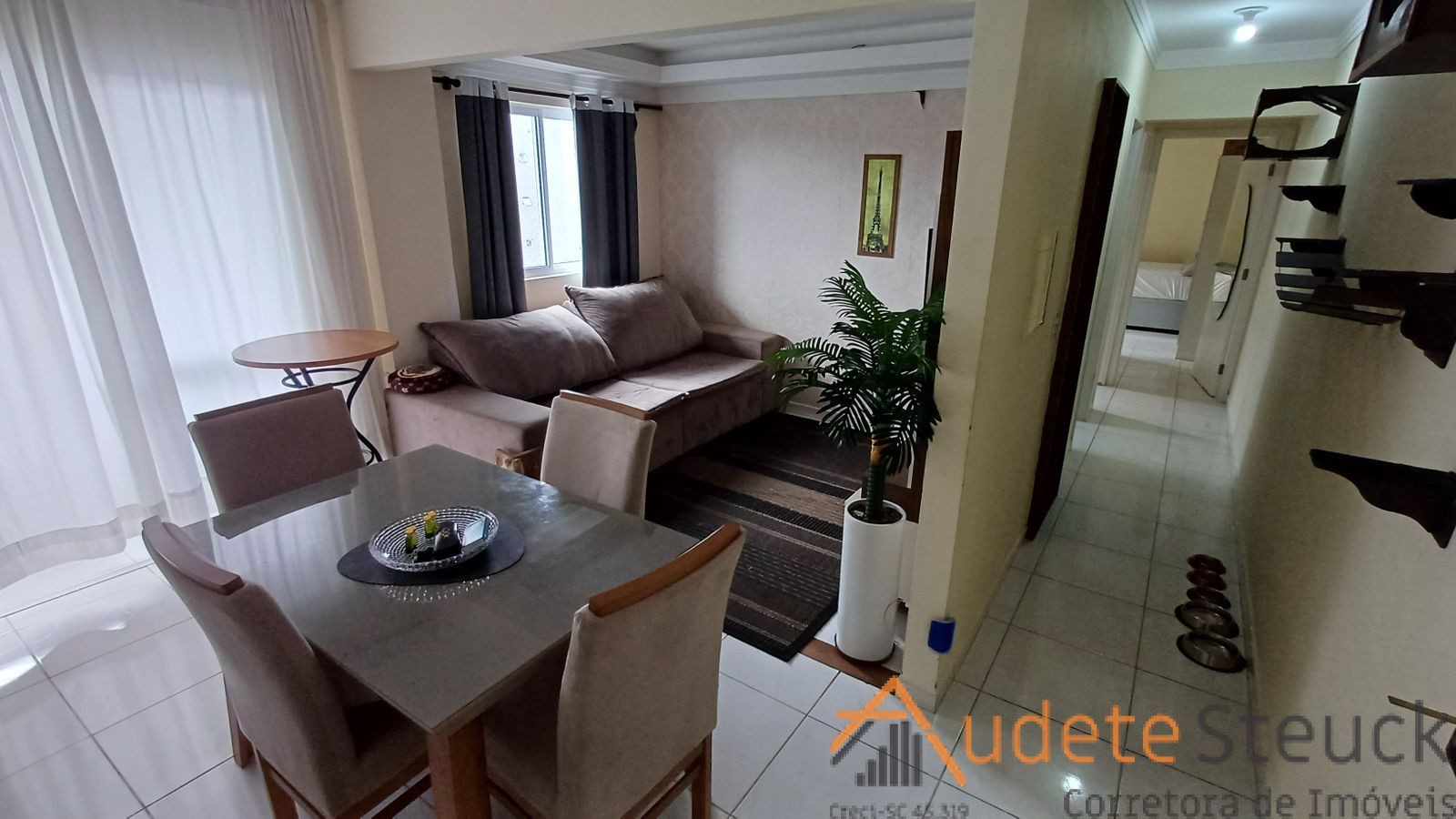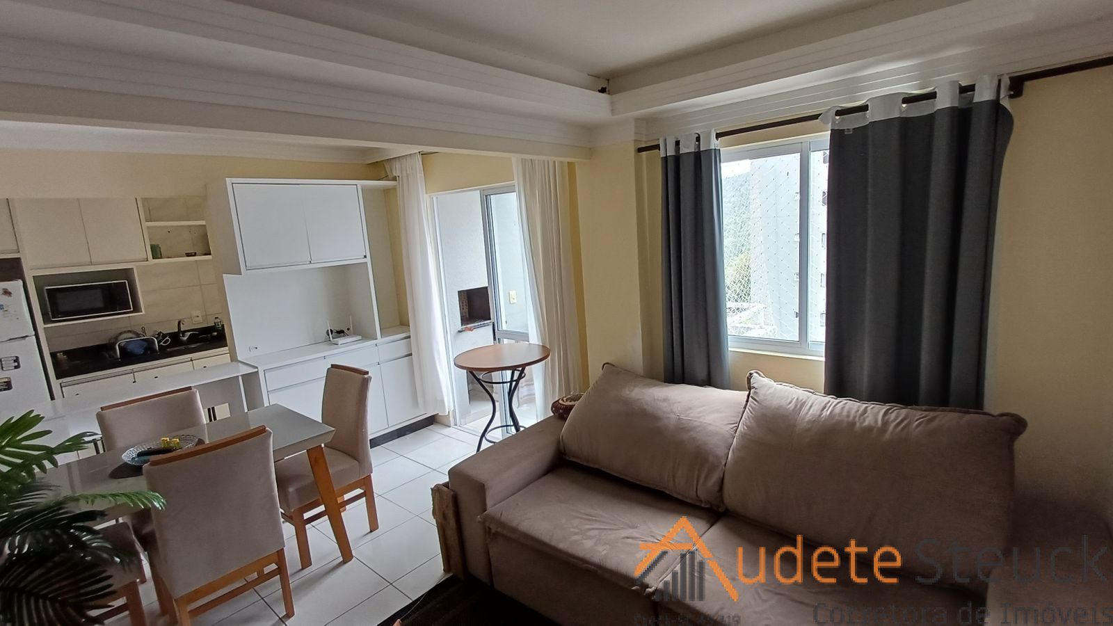 • Sala de Estar/Jantar: Sofá confortável, tapete, mesa de jantar com cadeiras.