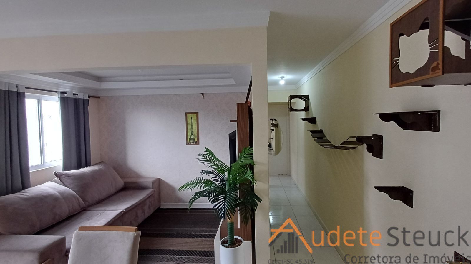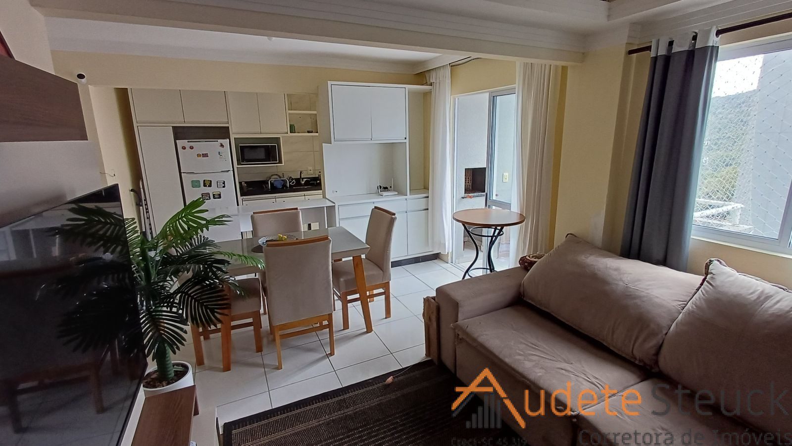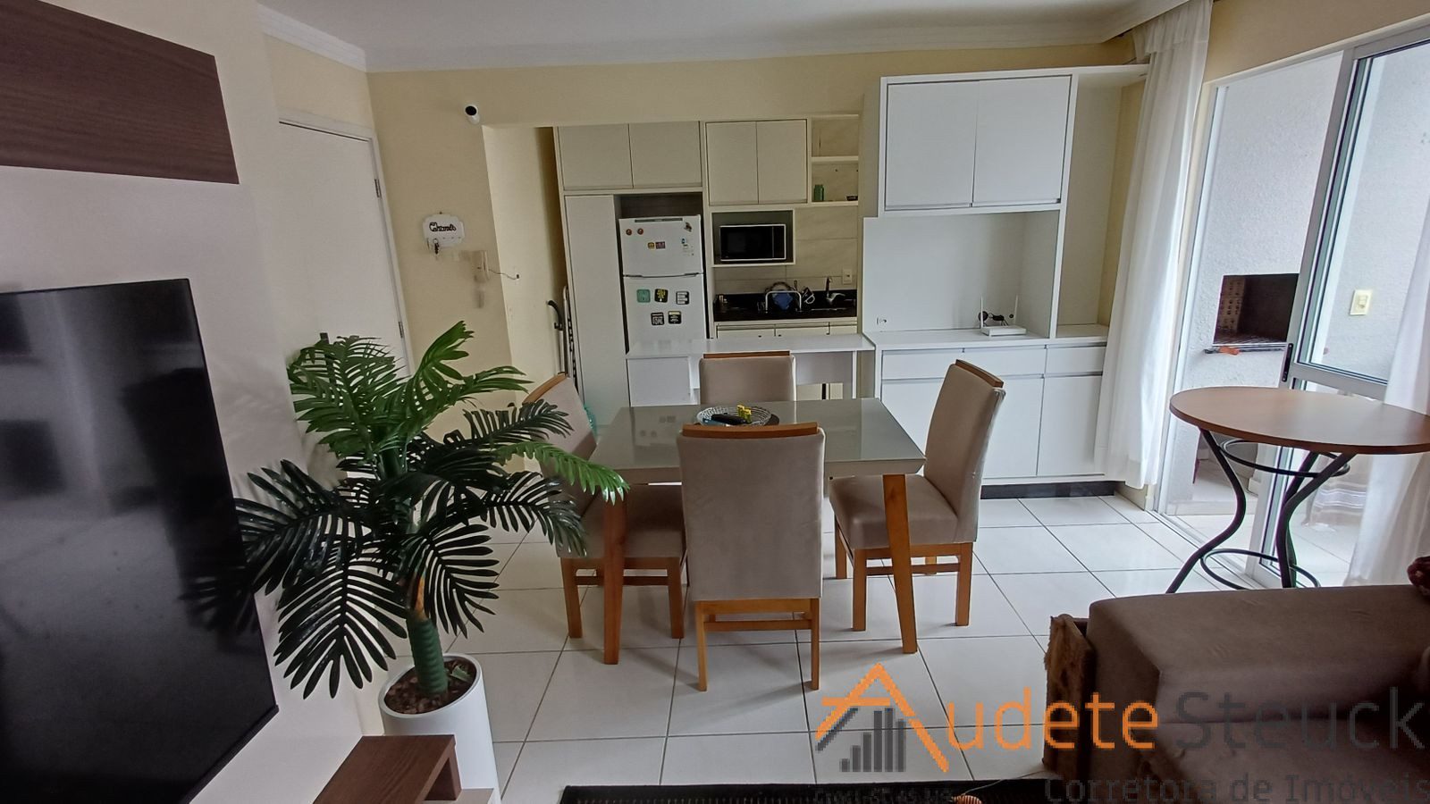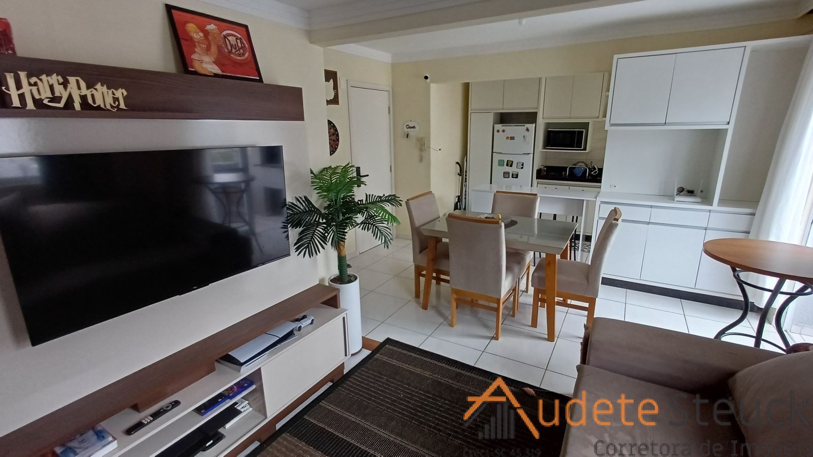 • Sala de Estar/Jantar: Sofá confortável, tapete, mesa de jantar com cadeiras.